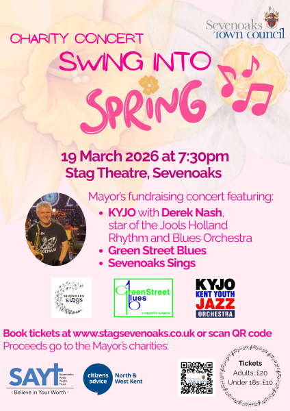You are invited to a marvellous evening at The Stag Theatre, hosted by Cllr Tony Clayton, Mayor of Sevenoaks. We're calling it 'Swing into Spring' and it's set to be an entertaining night filled with the captivating sounds of jazz and choir singing, all in support of two fantastic charities: Citizen's Advice and the Sevenoaks Area Youth Trust.