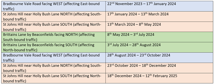 The St Johns Hill and Brittains Lane locations were successfully installed as bi-directional, meaning that the SID can be turned around to face the other direction after the initial 8 weeks facing one direction. Bradbourne Vale Road however is operational only facing West, due to the site not being viable for Eastern facing infrastructure. This leaves the SID with five scheduled different placements between three locations.