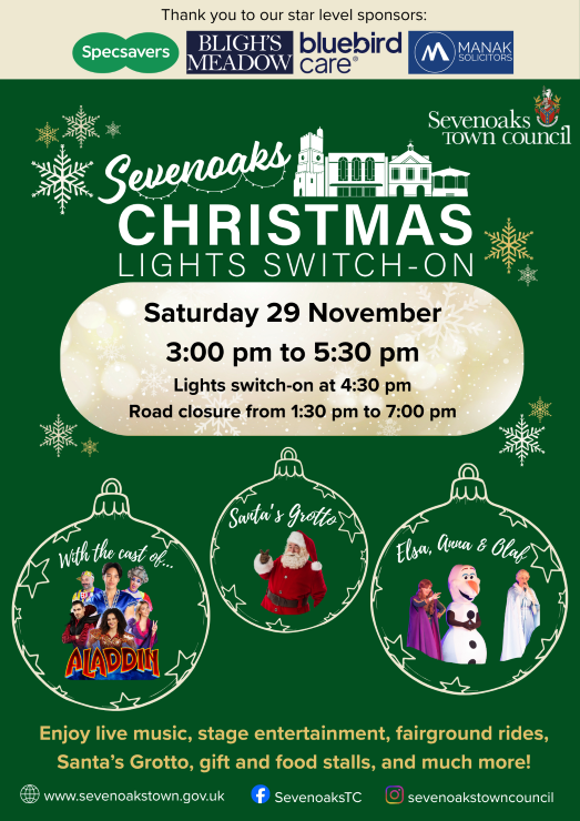 Sevenoaks Town Council invites the community to come along to this year’s Christmas Lights Switch-On event in Sevenoaks High Street on Saturday 29 November.